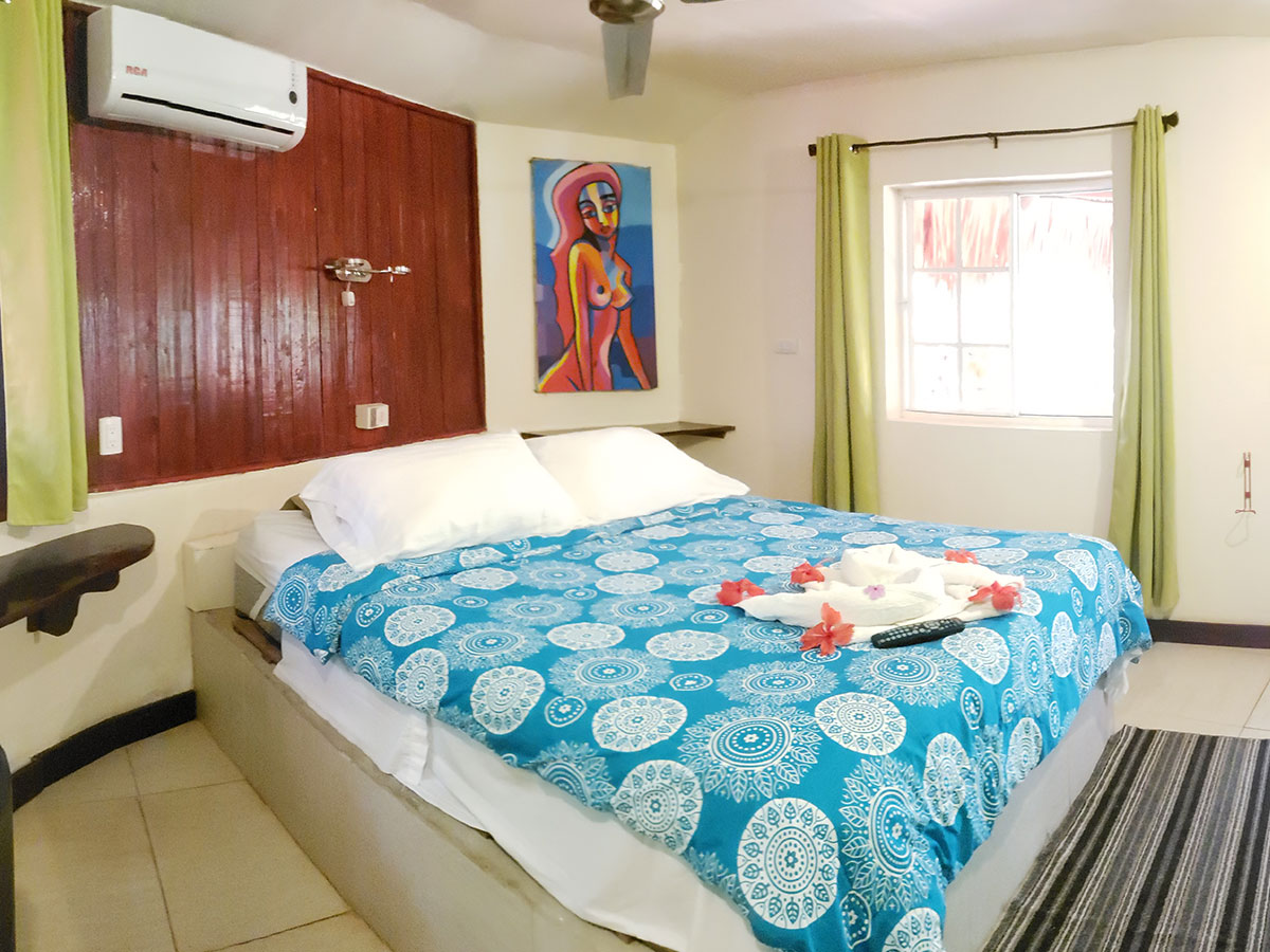 Acogedora cabaña para 2 personas con cama queen, porche y hamacas para relajarse.